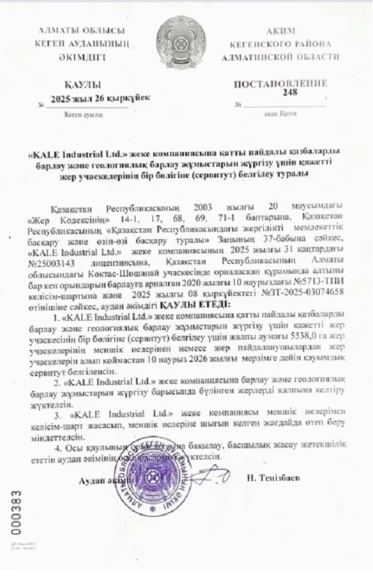 Согласно постановлению акима Тенизбаева от 8 октября 2024 года, компания Kale Industrial Ltd получила во временное пользование 5 175 гектаров до 1 января 2026 года. Разрешение выдали для топографо-геодезических и изыскательских работ.