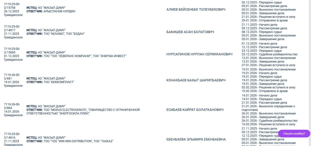Елеусинов также сообщил, что компания подавала частную жалобу, но апелляция оставила определение в силе. Также выяснилось, что у АО «Жасыл Даму» действительно много исков. На скрине ниже видны только последние.