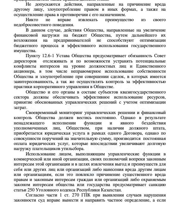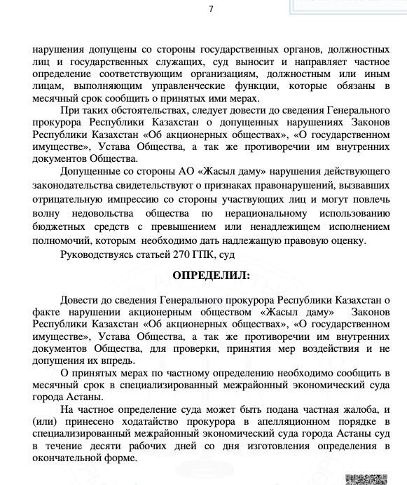 Эксперт также сопроводил свой пост скриншотом, где и сказано, что суд направил частное определение в Генеральную прокуратуру. Согласно документу, прокуратура должна проверить деятельность АО «Жасыл Даму» на предмет нарушений законов, устава и внутренних документов общества и в течение месяца сообщить о принятых мерах в специализированный межрайонный экономический суд Астаны.