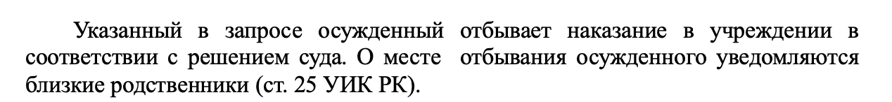 В 2003 году его приговорили к 25 годам лишения свободы, он должен был выйти только в 2028 году. Однако с зачётом времени в СИЗО и последующего освобождения по статье 73 УК РК он покинул колонию в 2021 году.