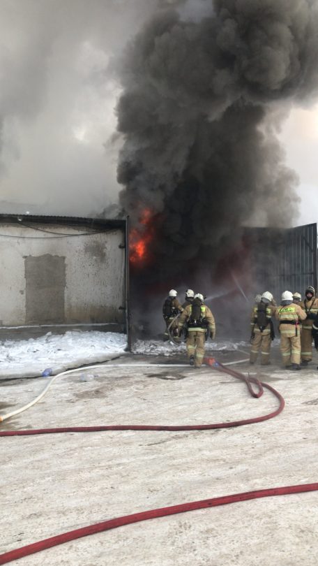 Складские помещения с товарно материальными ценностями горят в Алматы. Огонь быстро распространяется по объектам. Пожарные сообщают, что наблюдается обрушение конструкции кровли.