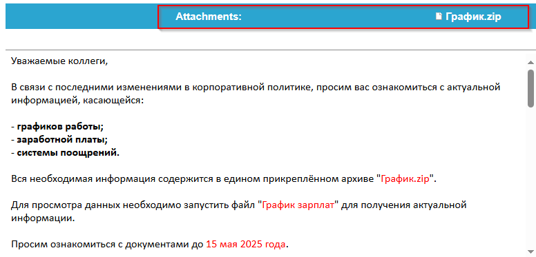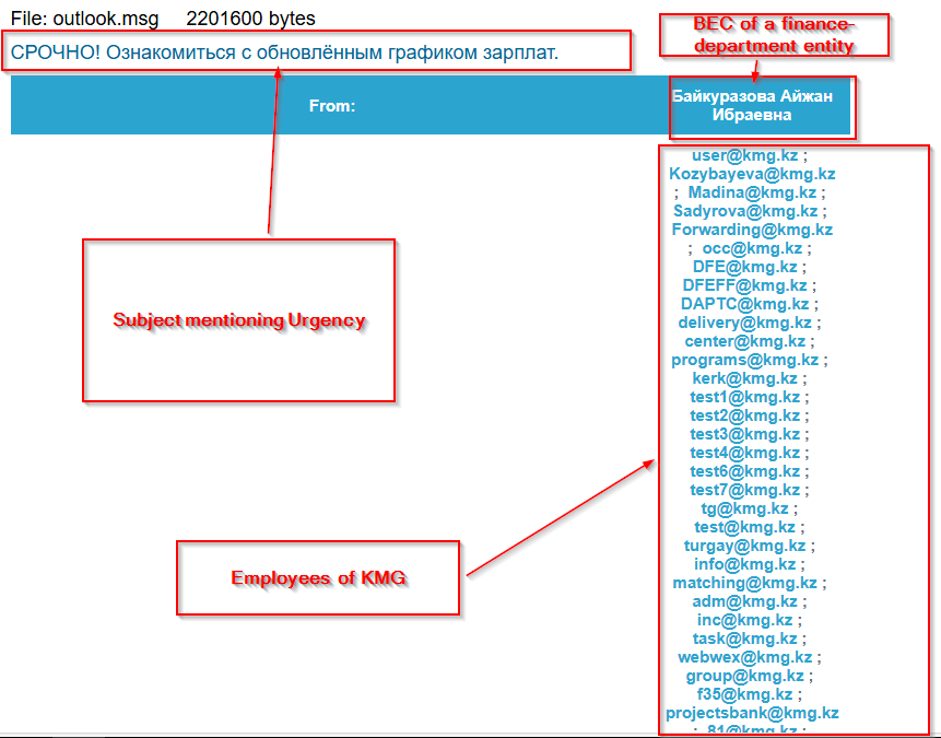 «Кампания нацелена на сотрудников “КазМунайГаза”. Файл с угрозой рассылают под видом фейкового документа, связанного с IT-подразделением КМГ. Документ замаскирован под внутреннюю переписку на такие темы, как обновление политик, процедуры внутренней сертификации и график зарплат»,пишет Malware News.