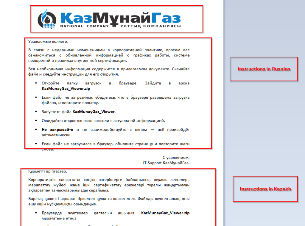 В письме, скриншоты которого приводит Malware News, использован логотип «КазМунайГаза» и приведены подробные инструкции на казахском и русском языках, как загрузить и открыть вредоносный файл. Чтобы усыпить бдительность адресатов, в тексте упоминается IT-отдел КМГ. Но при открытии ссылки, которую рассылали злоумышленники, начиналась загрузка файла с зарубежного сервера, который затем устанавливался на компьютер жертвы и запускал вредоносный скрипт.