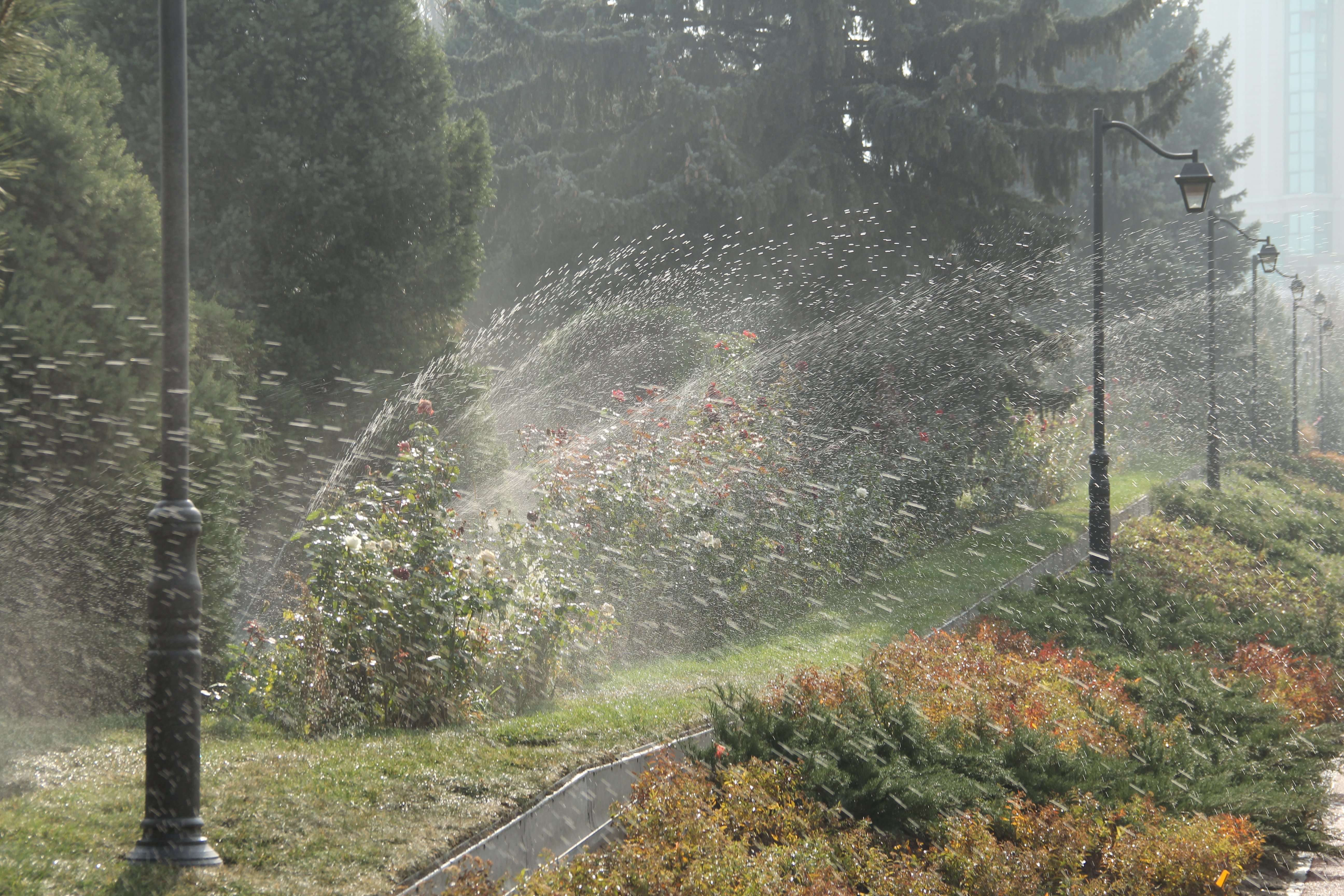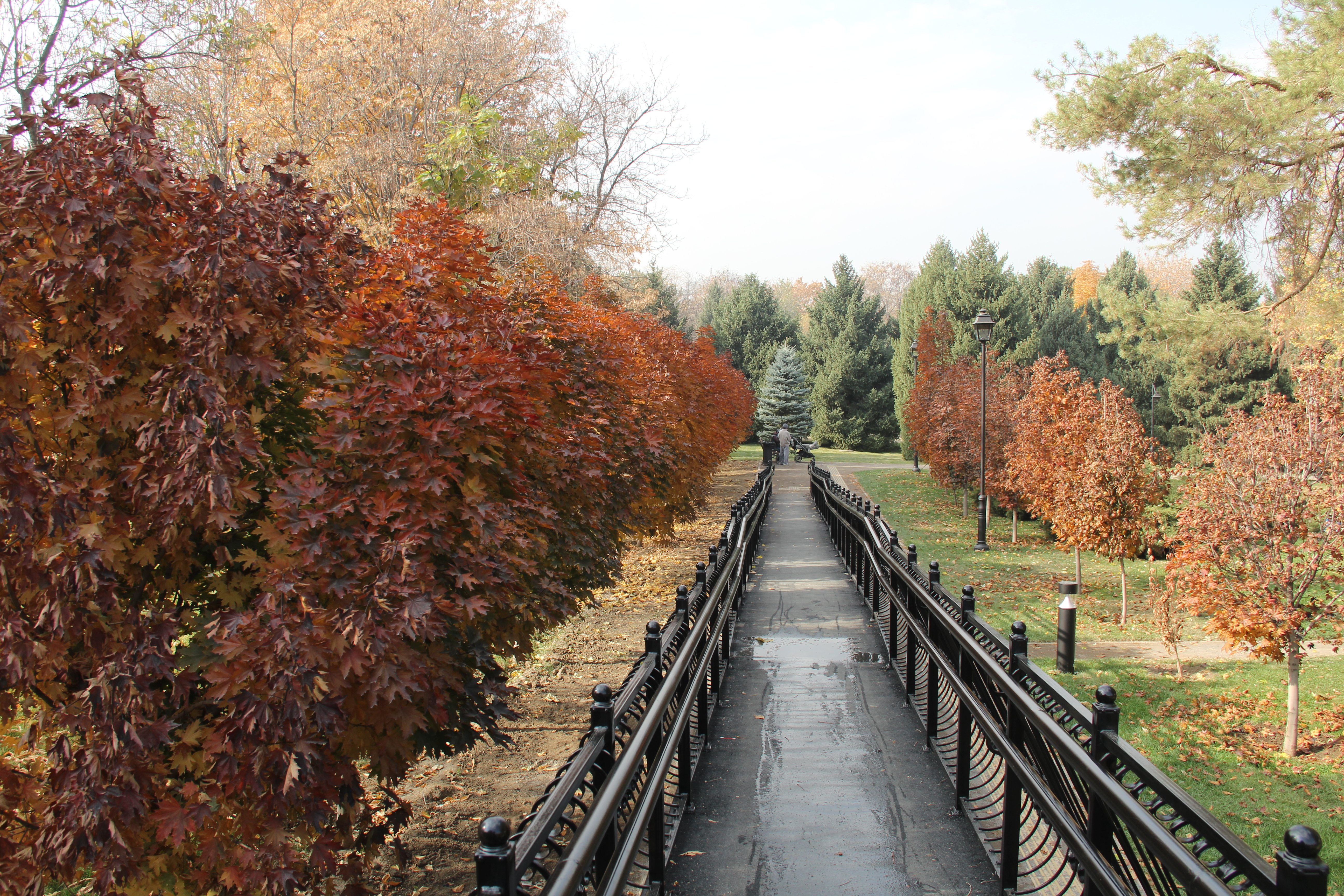 К прудику мы как раз и направляемся. По дороге обращает на себя одна из ложек дёгтя пока не открытого парка — система полива. Вода из поливалок частично брызжет не только на траву и деревья, но и на дорожки. В итоге там, где асфальт, дорожки просто сырые, а там, где мелкий гравий, вода смывает покрытие вниз. Парк-то расположен на склоне.