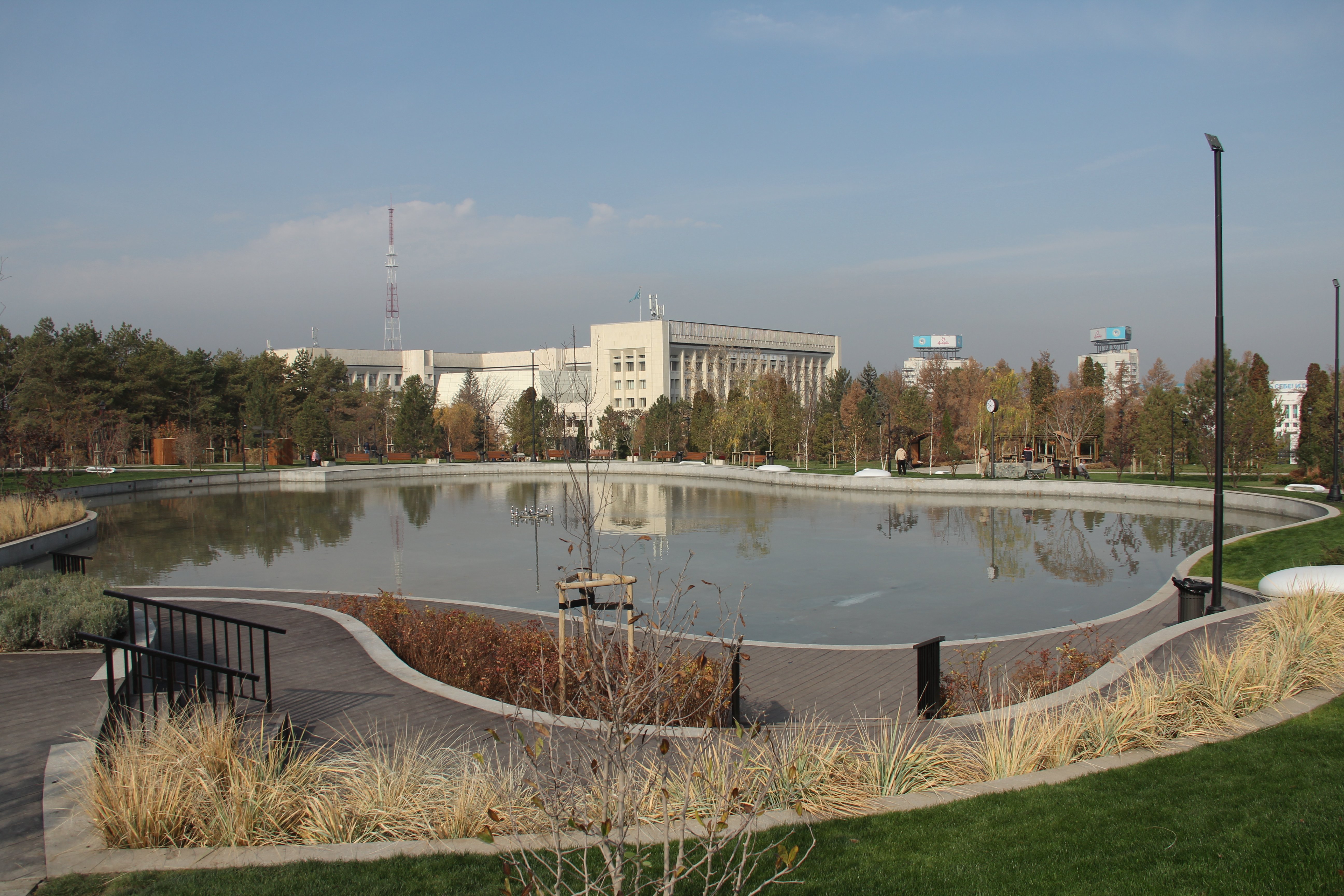 Ах да, пруд! Мы до него таки дошли. Пруд симпатичный (хоть и видно, что дно грязное). С одной стороны в нём отражается угол здания акимата. С другой — Центральный госмузей.