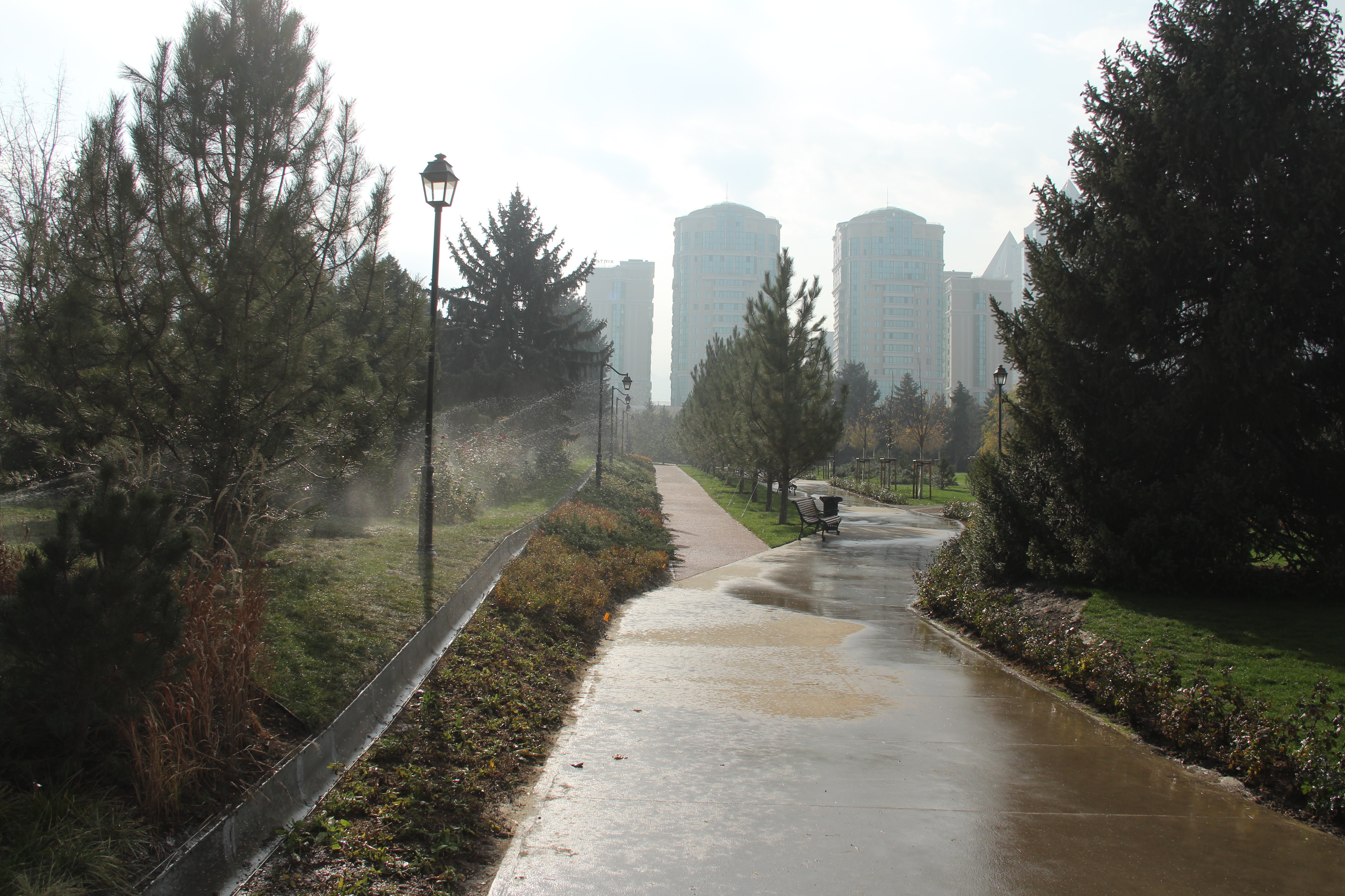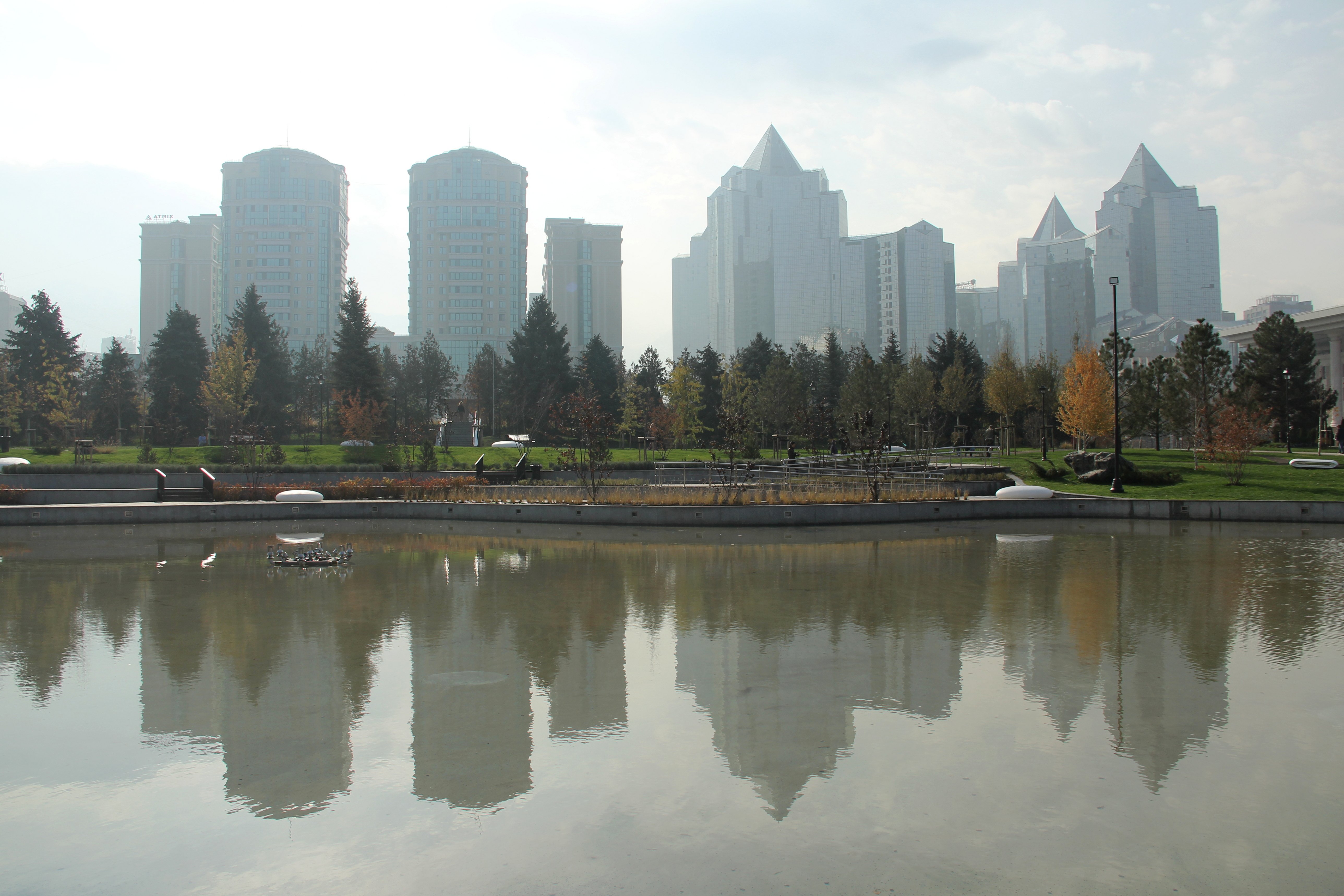 Но, пожалуй, лучше всего в нём отражаются башни БЦ «Нурлы Тау» и ЖК «Жеруйык». Наверное, не будь их, из сквера открывался бы прекрасный вид на горы. Зимой на прудике обещают заливать каток. Главное, чтобы погода позволила.