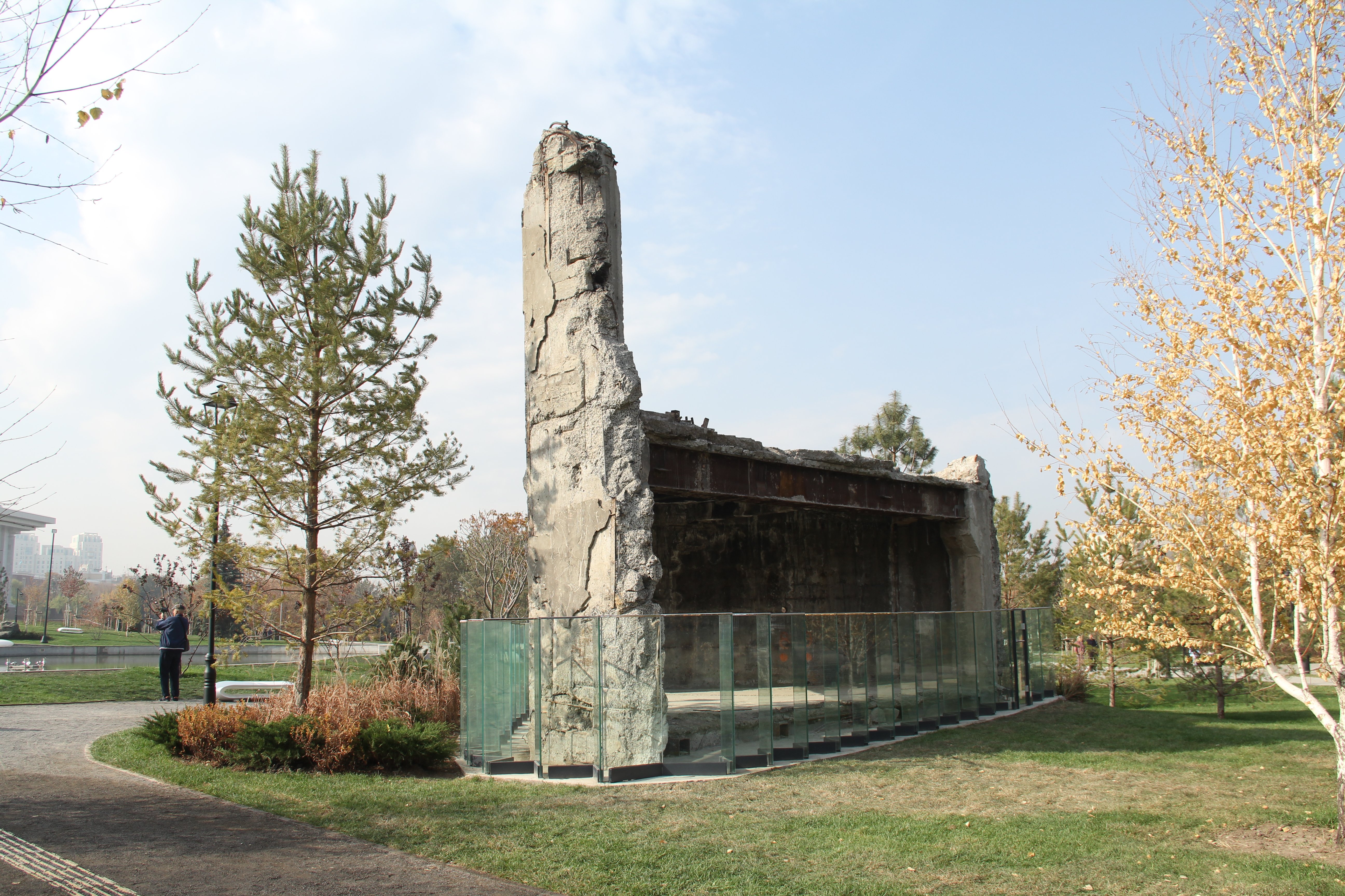 Ещё здесь же, на берегу прудика, оставили часть разрушенной резиденции. Она обнесена невысокой стеклянной загородкой, а на бетоне видны следы копоти от того самого пожара. Как напоминание того, что здесь происходило в январе 2022-го.