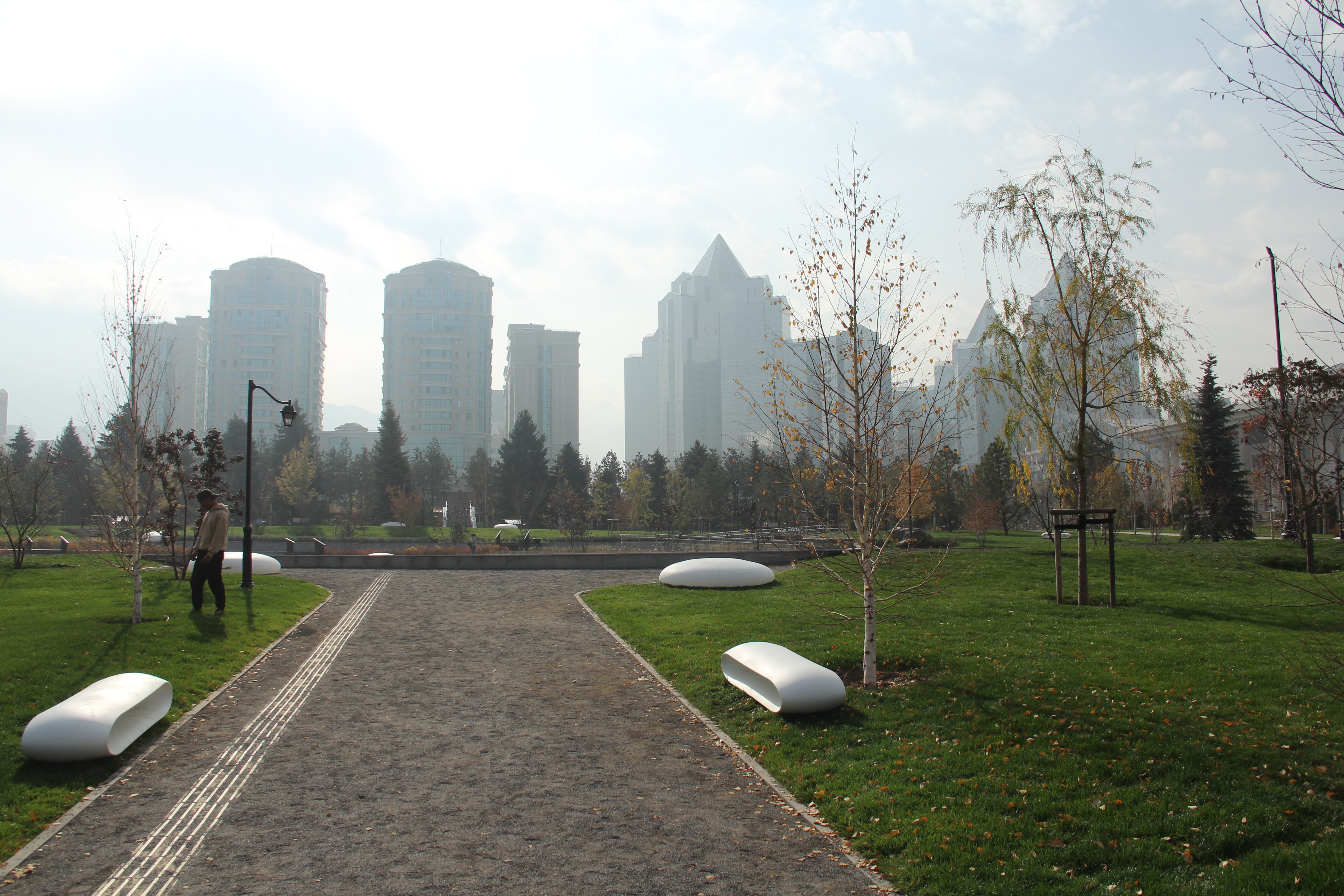 По территории разбросаны белые пластиковые светильники. Некоторые из них напоминают камни, некоторые — скамейки. По их поводу у журналиста Orda.kz возникли опасения, что на них кто-то может примоститься и сломать.