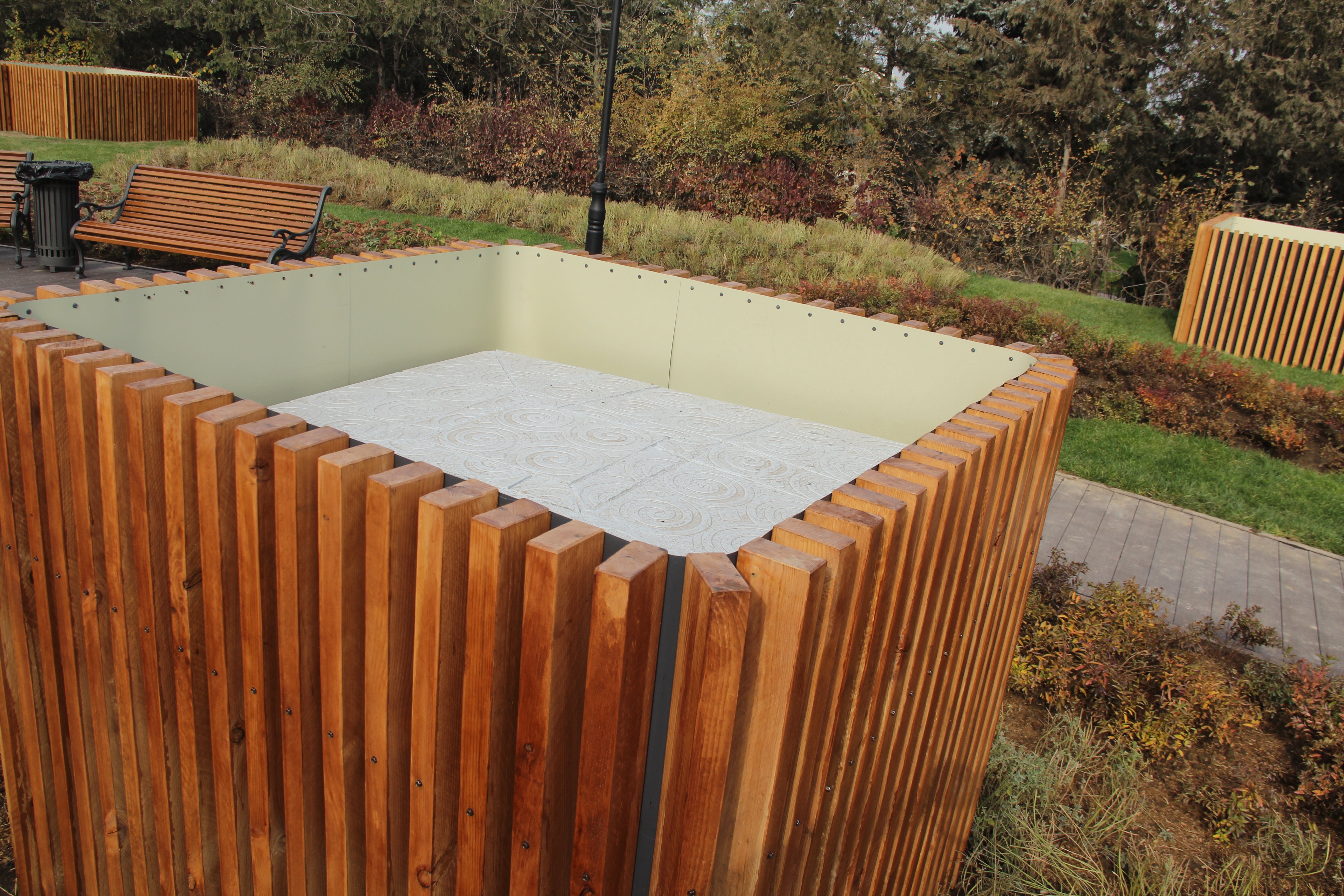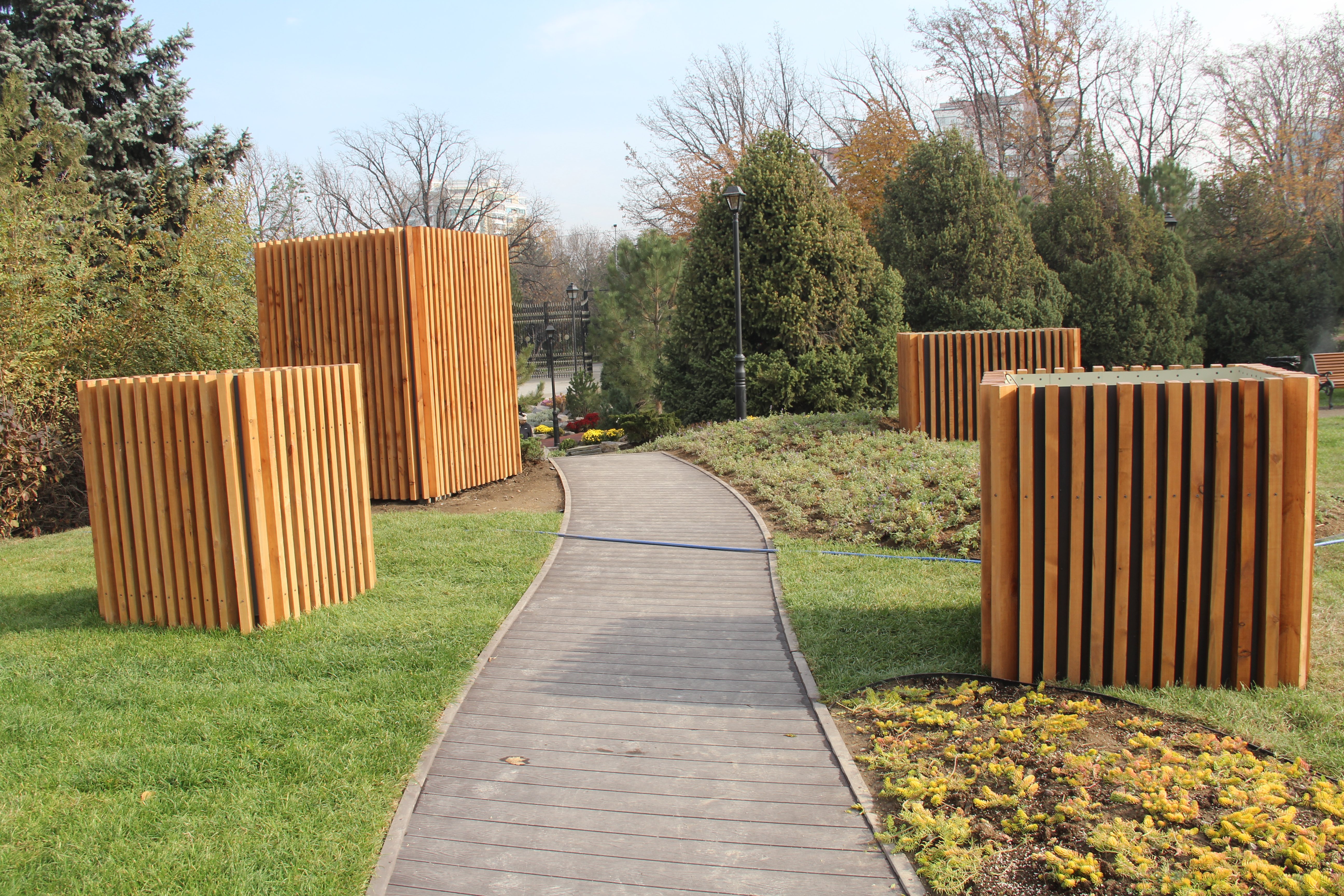 В верхней части сквера стоит несколько деревянных конструкций, назначение которых на первый взгляд не особо понятно.