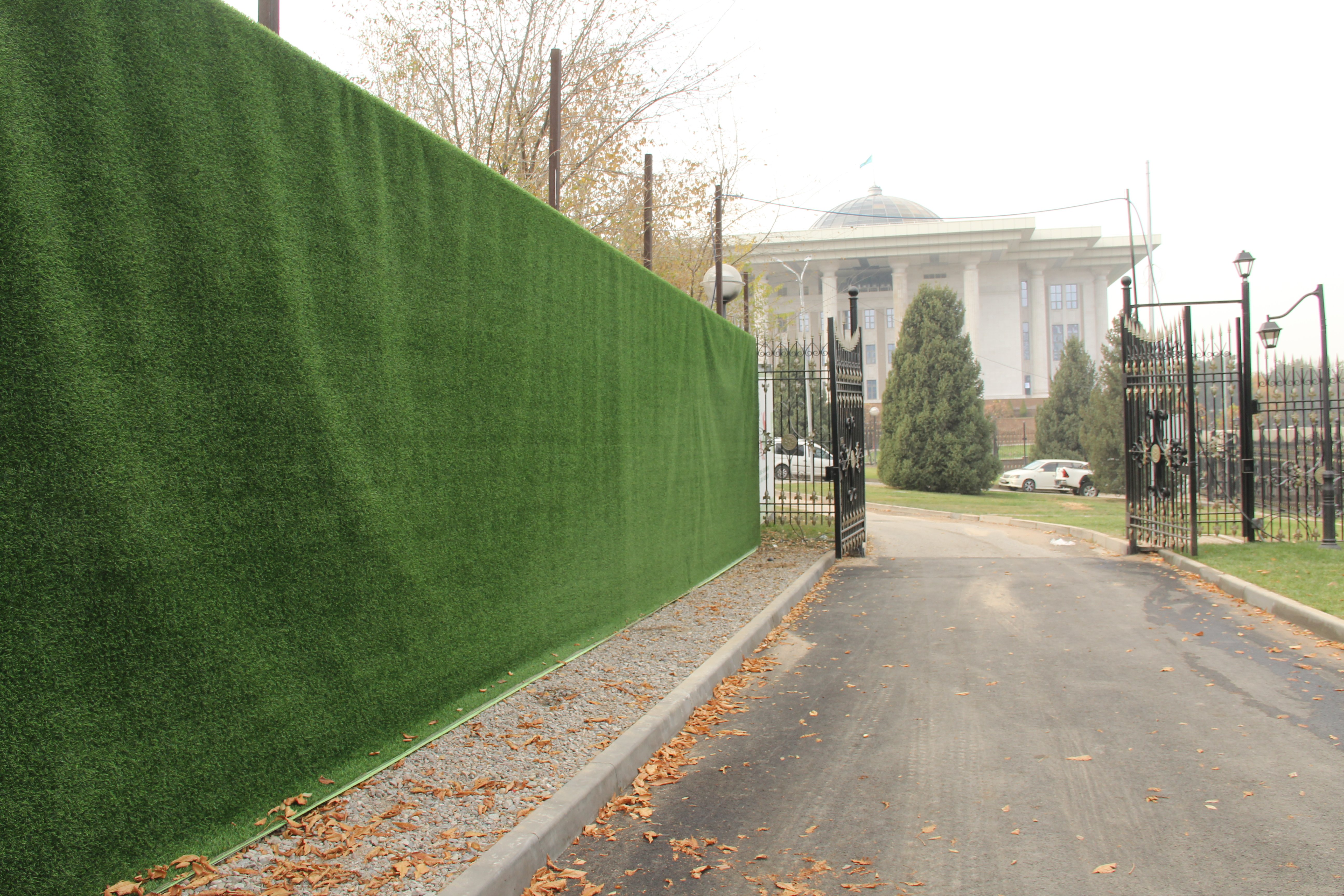 А вот второй вход справа огорожен зелёным забором. Правда, не из металлопрофиля, как это часто бывает, а из искусственного газона.