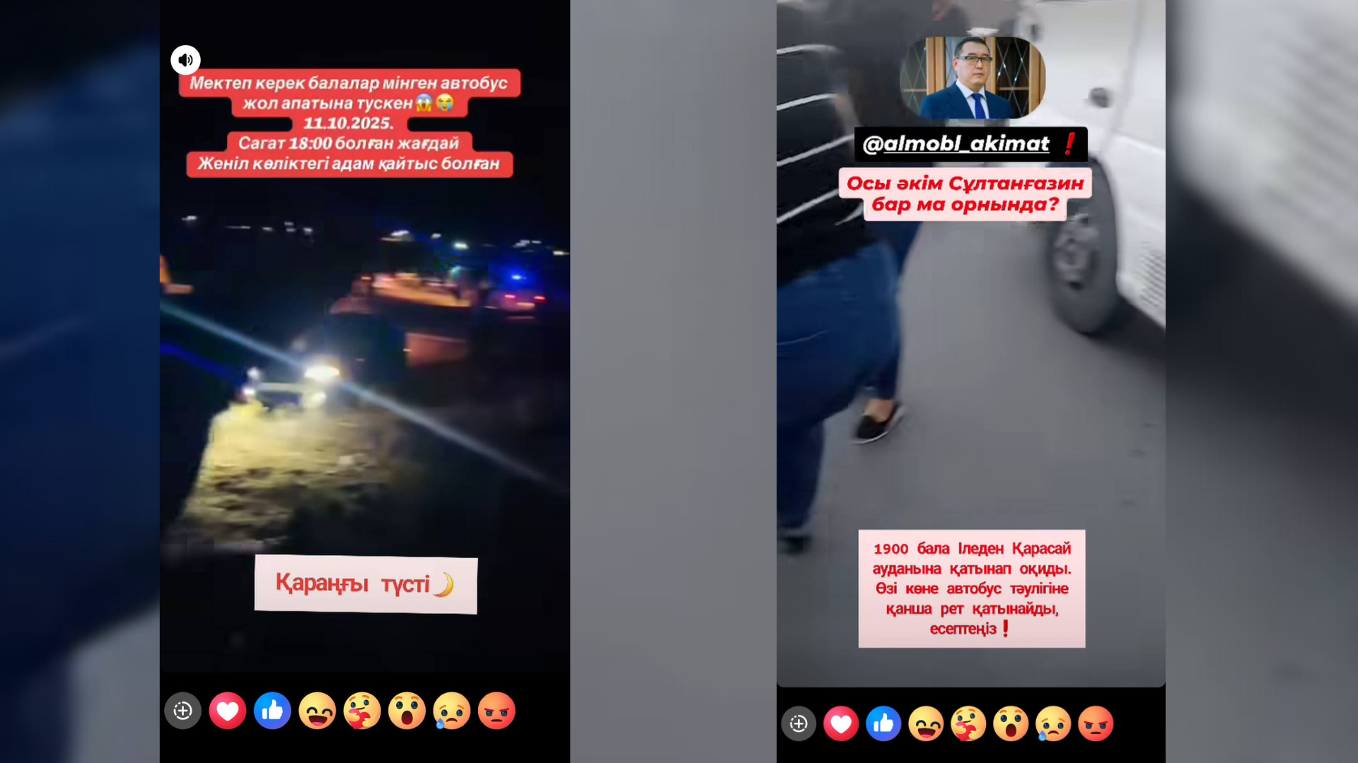 Автобусом с госномером KZ 607 ANE управлял Сандибек Нурманов, который перевозил детей по просьбе родителей. Водитель легкового автомобиля Hyundai Accent выполнял разворот и не уступил дорогу автобусу, из-за чего случилось жёсткое столкновение. По информации управления образования Алматинской области, состояние школьников стабильное, их жизни ничего не угрожает.