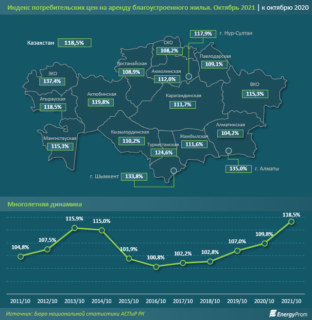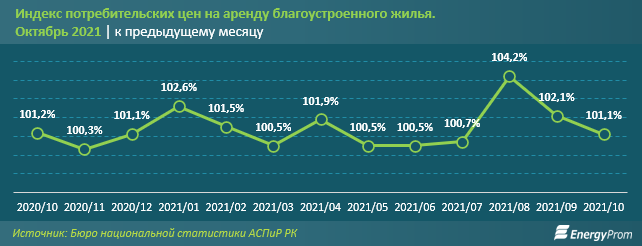 По данным Еnergyprom.kz, в октябре этого года стоимость аренды благоустроенного жилья увеличилась на 18,5% по сравнению с таким же периодом 2020 года. В прошлом году рост цен составил 9,8%.