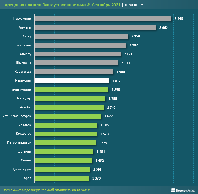 Дороже всего в сентябре аренда благоустроенного жилья обходится в столице – 3 443 тенге за квадратный метр, в Алматы чуть меньше – 3 062 тенге за квадрат.