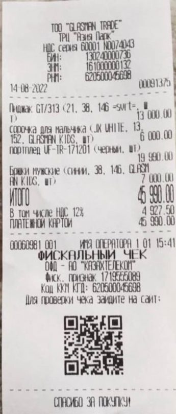 "В воскресенье мы вместе с сыном приобрели в магазине рубашки, костюм, брюки и галстук на сумму порядка 36 тысяч тенге. В приложенных чеках можно увидеть стоимость и подсчитать общую сумму. Также, кроме школьной формы, в чеке можно увидеть приобретённый портплед для костюмов на сумму около 20 тысяч тенге. В подтверждение ответа прилагаю фото чеков о покупке. В одном чеке сумма на 26 тысяч тенге (Пиджак. Брюки. Рубашка). Во втором чеке - более 10 тысяч тенге (еще одна рубашка и галстук). Итого более 36 тыс тенге. Портплед - около 20 тысяч тенге. Также хотел бы добавить, что есть часть школьной формы, которая была приобретена ранее и будет доношена ребенком в этом году", - написал он в посте на своем аккаунте Facebook.