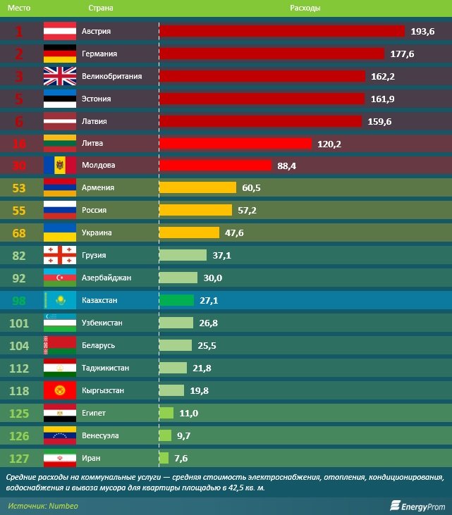 Казахстан занял 98-е место по дороговизне коммунальных услуг среди 127 стран, а расходы на них составляют 5,1 % от средней зарплаты. Аналитики рассказали, жители каких стран раскошеливаются меньше, сообщает Orda.kz со ссылкой на EnergyProm.