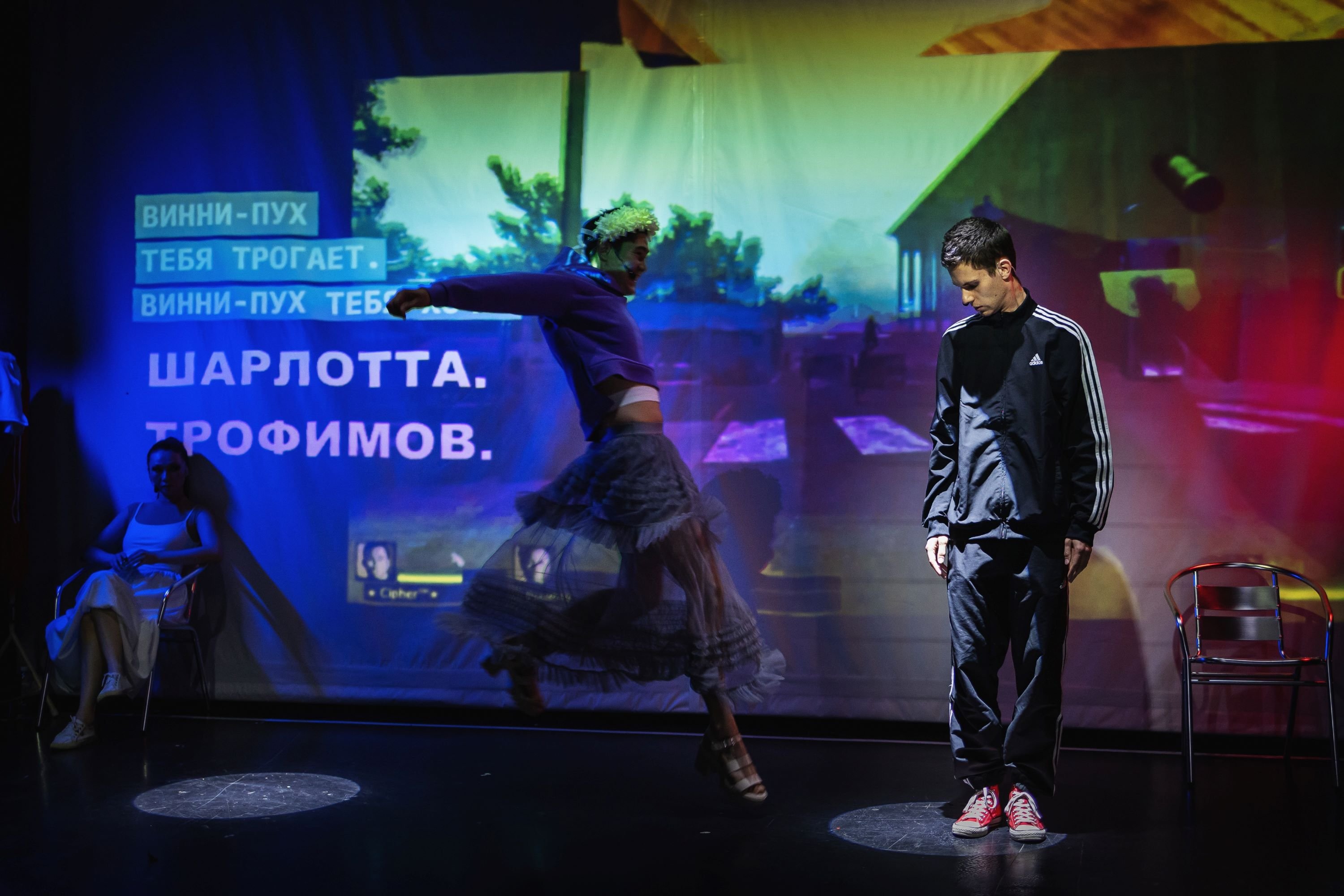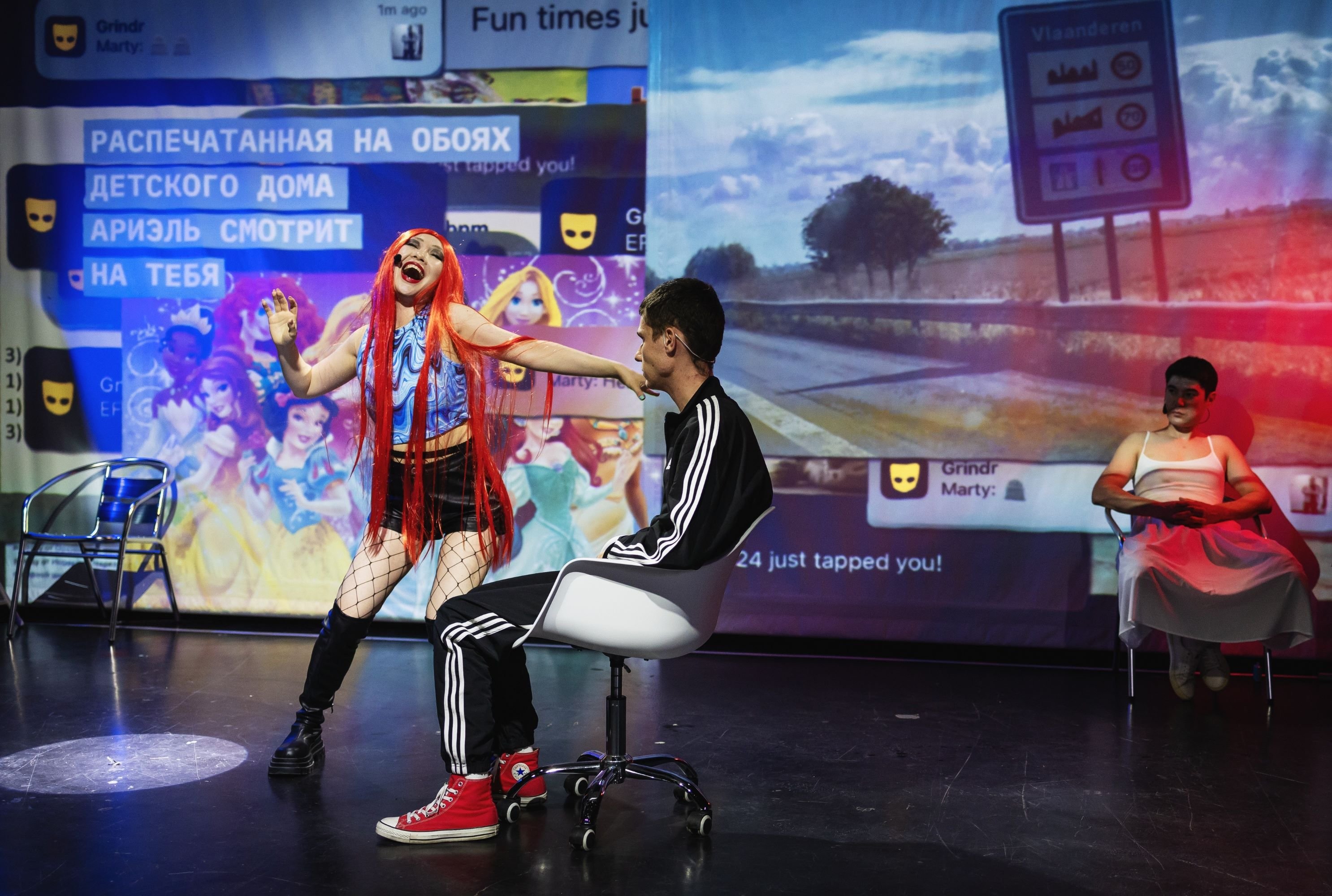 Статичны только тон голоса и выражение лица Марка Куклина, который в своём спектакле исполнил и главную роль. На подмогу ему и Куантаю Абдимади пришла Улжан Алпысбай. И это трио весь час спектакля ходит по лезвию – например, парни облачаются в обтягивающие платья, пока во весь экран транслируется архивная запись визита Александра Лукашенко в детский дом.