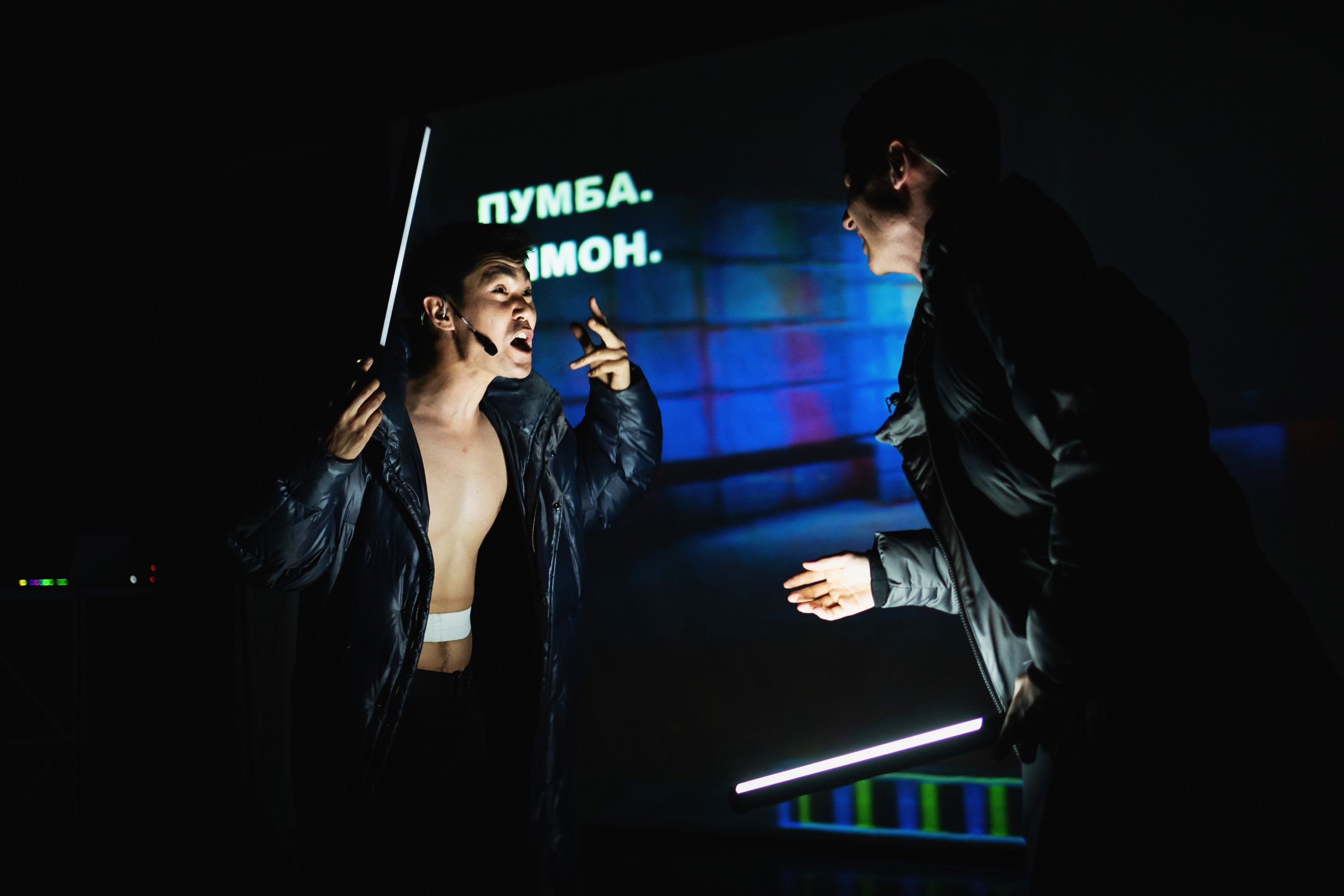 Громыхающее техно прорывается сквозь закрытую дверь, где уже дежурит неожиданный секьюрити – Куантай Абдимади. Он ставит печати-пропуски зрителям на запястье, и вот они уже не просто на вечеринке, а на первом в Казахстане спектакле в жанре «рейв-драма». Сама эта культура вновь становится модной в Алматы – взять хотя бы утренние рейвы, которые проходят в городских кофейнях по выходным. Да и фрагменты техно-танца в спектаклях тоже были – например, в «Животном» режиссёра Дмитрия Гомзякова. Но вот в степень театрального жанра рейв впервые возвёл постановщик Dark Room Марк Куклин.