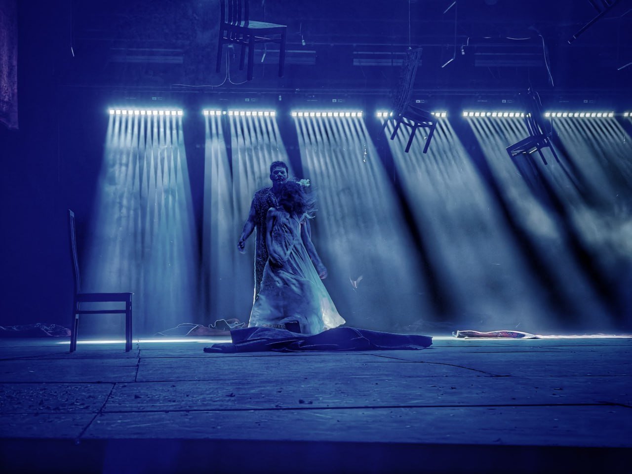 Причём назвать премьеру очень вызывающей нельзя. Да, это авторское переосмысление классики с некоторыми допущениями, но, в целом, сюжет соблюдён, актёрские экзерсисы, даже когда кто-то кричит или творит дичь на сцене, не выглядят фарсом и оправданы, поэтому предфинальная сцена дуэли оказалась несколько неожиданной. Нового «Гамлета» стоит высидеть как минимум ради неё (а потом будет почти библейское распятие, но это уже на грани спойлера). Высидеть, потому что с вентиляцией в казахском ТЮЗе, увы, по-прежнему, проблемы, и полный зал в разгар июльской жары – то ещё удовольствие.