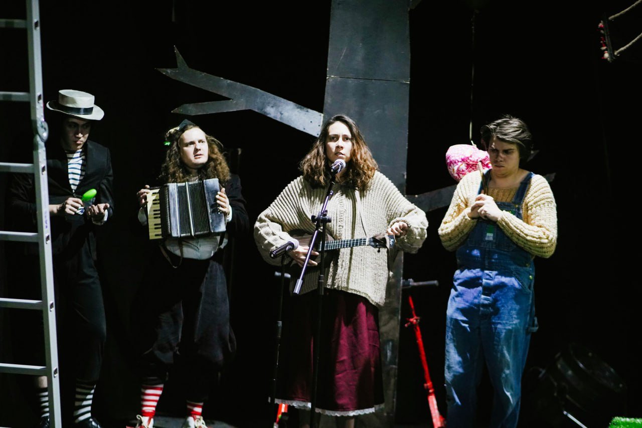 Данный переход чувствуется и в сценографии. Несмотря на всю мрачность спектакля, одна из его основных декораций – качели. Такие приветы из детства спрятаны тут и там: и в появляющейся на сцене неваляшке, и в старом ковре на стене, на котором перед сном здорово было рассматривать узоры. А вот от одной из своих главных фишек «Тотальный театр» решил отказаться: кукол в спектакле нет, за исключением маленького медведя в эпизоде. Зато им на смену приходит театр теней: например, заколдованный лес появляется силуэтами ёлок. Ко всему этому добавляется и живой саундтрек – герои поют и аккомпанируют себе.