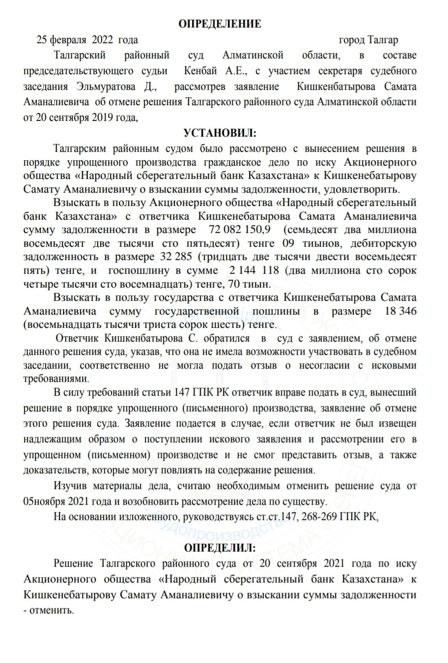 В 2019 году Талгарский районный суд Алматинской области вынес решение взыскать с Самата Кишкенебатырова в пользу банка сумму задолженность в размере 74 миллионов тенге (из них сумма задолженности перед банком – 72 миллиона, 32 тысячи тенге составила дебиторская задолженность и 2 миллиона тенге – госпошлина).