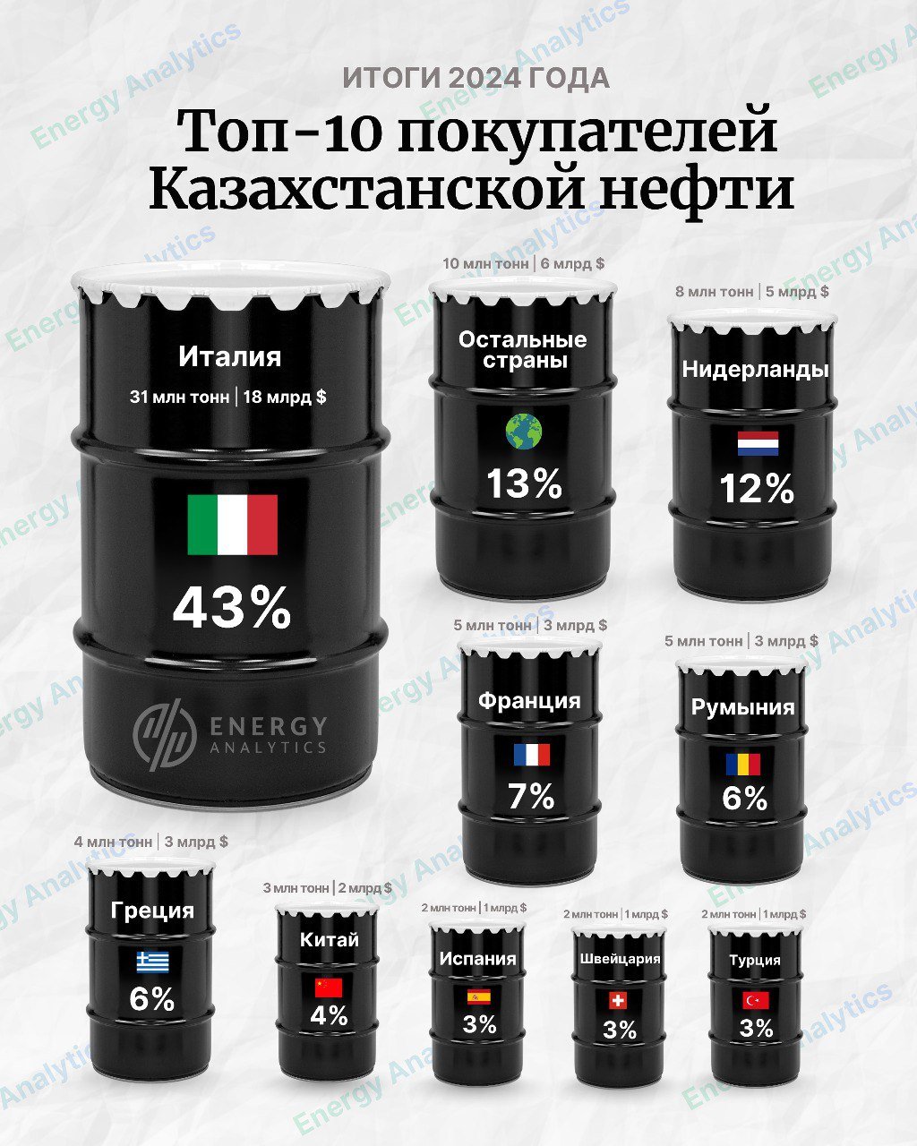 Как подсчитал отраслевой аналитик Абзал Нарымбетов, по итогам прошлого года главным импортёром нефти из Казахстана стала Италия. В своём телеграм-канале Energy Analytics эксперт указывает, что эта страна приобрела 43 % всего «чёрного золота», экспортированного из РК в 2024-м. Впрочем, это не означает, что вся купленная у Казахстана нефть остаётся в Италии: существенная её часть идёт в Германию.