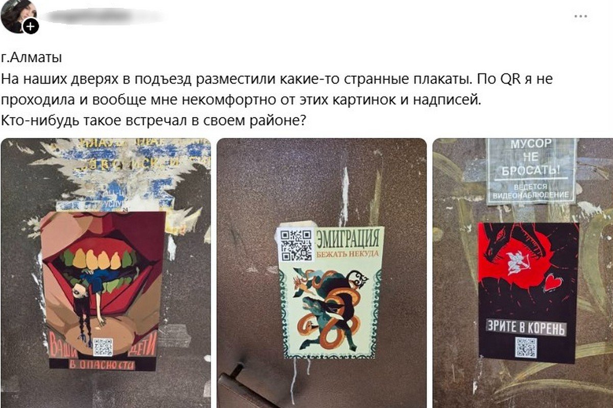Жительница Алматы рассказала в соцсетях о подозрительных плакатах, появившихся на дверях подъезда дома, где она живёт. По её словам, это яркие иллюстрации с необычными и даже тревожными образами, сообщает Orda.kz.