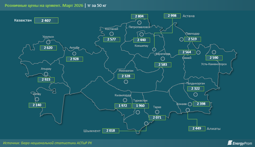 Средняя цена за мешок цемента (50 кг) в марте составила 2,4 тыс. тенге. Дороже всего он стоит в Астане и Петропавловске — около 3 тыс. тенге, дешевле всего — в Туркестане, Кызылорде и Шымкенте.