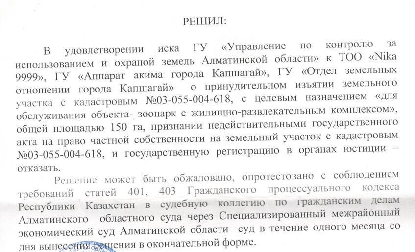 Мы проверили: про отмену постановления акимата Капшагая от 2 июля 2007 года о передаче участка ТОО «Капшагай-Зоопарк» в решении суда действительно ничего не говорится.