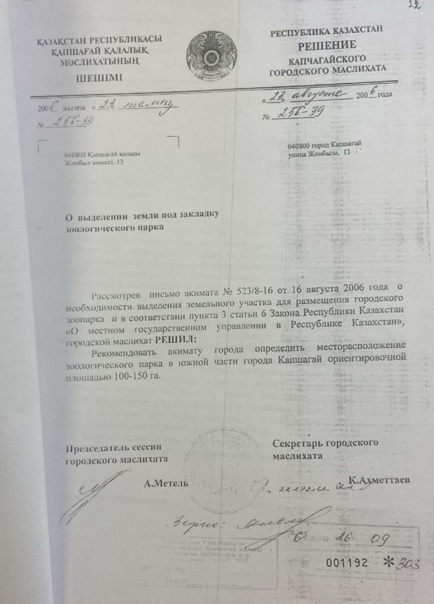Во время суда и выяснилось, что история несостоявшегося зоопарка в Капшагае началась не в июле 2007-го, а почти на год раньше. В августе 2006 года городской маслихат одобрил создание экопарка в южной части города площадью 100–150 гектаров.