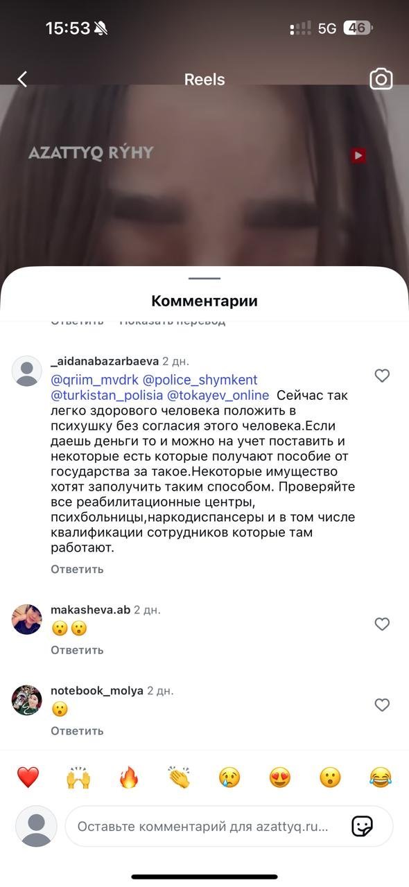 «Сейчас этим делом занимаются два департамента: в Абайском районе Шымкента расследуется дело по факту доведения до самоубийства, а в Туркестане — по факту похищения человека».