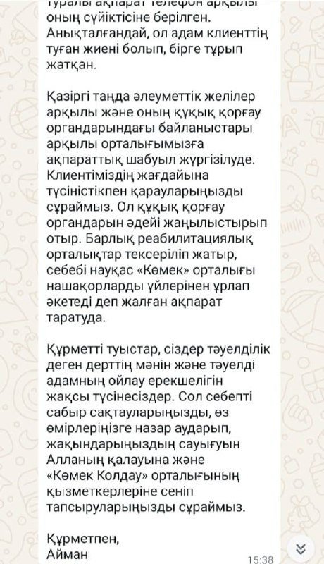 Мы также направили официальный запрос в Министерство здравоохранения с просьбой предоставить сведения о центре «Көмек». Ответа пока нет.