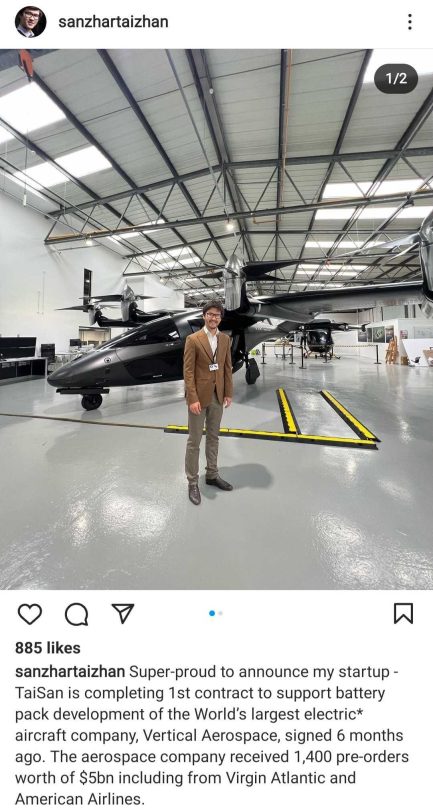 Он заявил, что TaiSan завершает первый контракт на поддержку разработки аккумуляторных батарей с крупнейшей в мире компанией по производству электрических самолетов Vertical Aerospace. Контракт между компанией и стартапом был подписан полгода назад. По словам Санжара, аэрокосмическая компания получила 1400 предварительных заказов на сумму 5 миллиардов долларов. В числе заявителей - Virgin Atlantic и American Airlines.