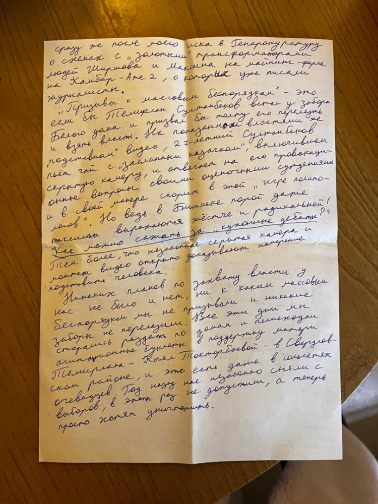 В письме от 22 ноября Кадырбек Атамбаев утверждает, что он и его коллеги никого не призывали к массовым беспорядкам и просто занимались агитацией в поддержку кандидата в депутаты Кыял Токторбаевой в Свердловском округе.