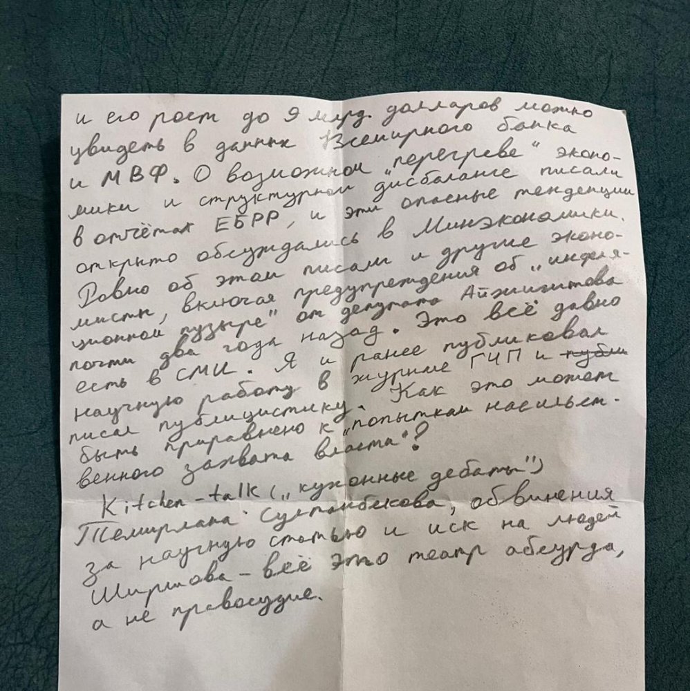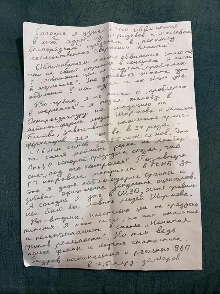 Издание Kaktus.media опубликовало написанные от руки письма Кадырбека Атамбаева, сына бывшего президента Кыргызстана Алмазбека Атамбаева, задержанного по делу о призывах к массовым беспорядкам. В них Атамбаев-младший рассказывает, что его теперь обвиняют в попытке насильственного свержения власти, а также называет предъявленные обвинения абсурдными, сообщает Orda.kz.