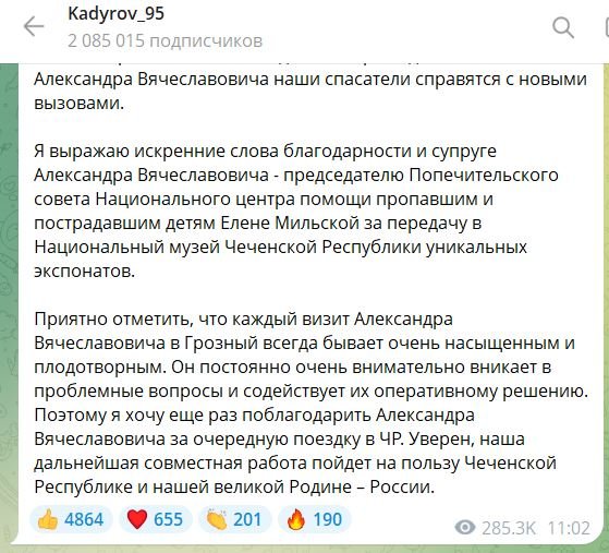 «Я выражаю искренние слова благодарности и супруге Александра Вячеславовича — председателю Попечительского совета Национального центра помощи пропавшим и пострадавшим детям Елене Мильской за передачу в Национальный музей Чеченской Республики уникальных экспонатов».