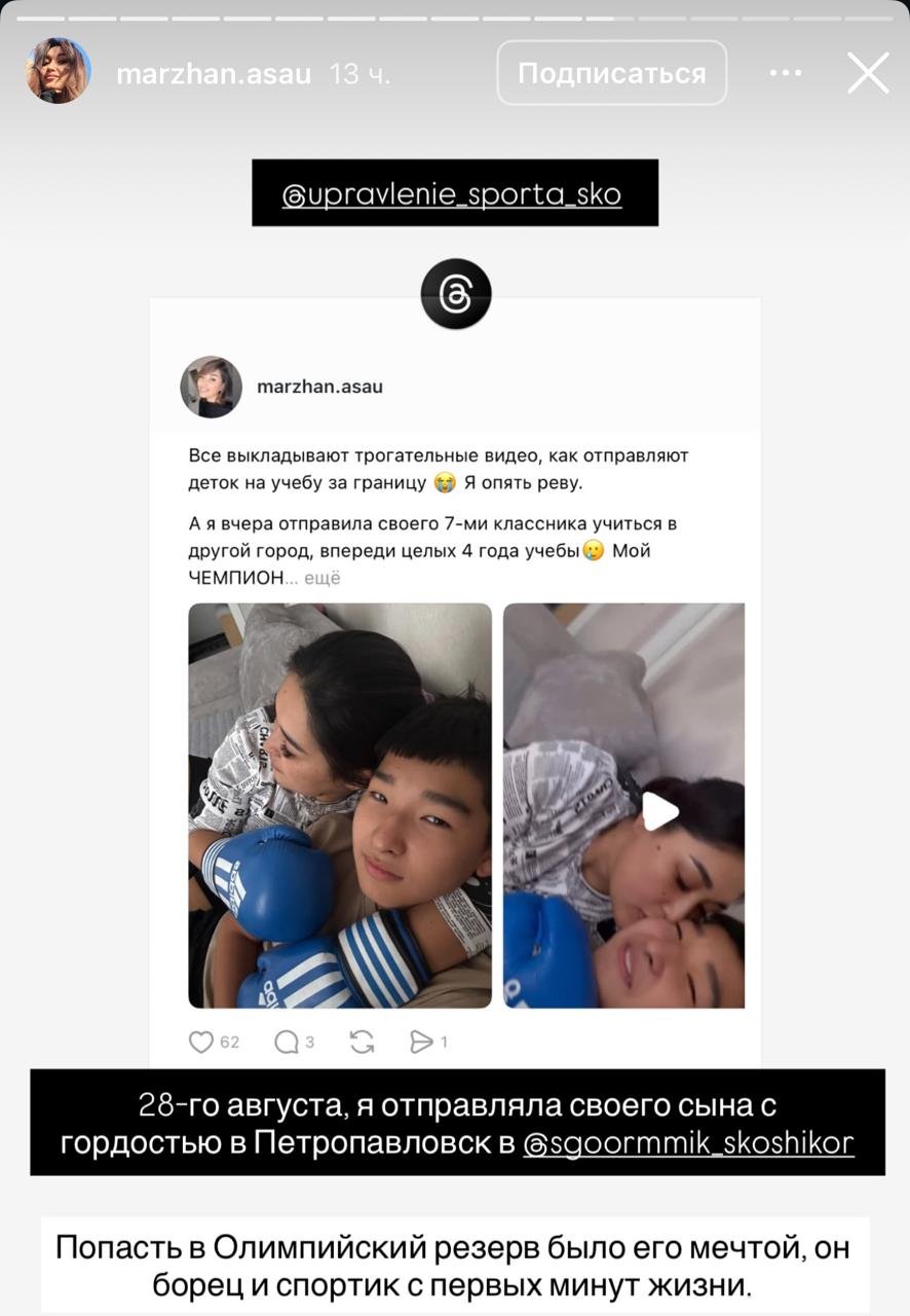 Жительница столицы Маржан Тажмуратова отдала своего сына учится спортивному мастерству в Северо-Казахстанскую областную школу. Женщина мечтала, что её ребёнок станет прославленым спортсменом, будет приносить медали своей стране.