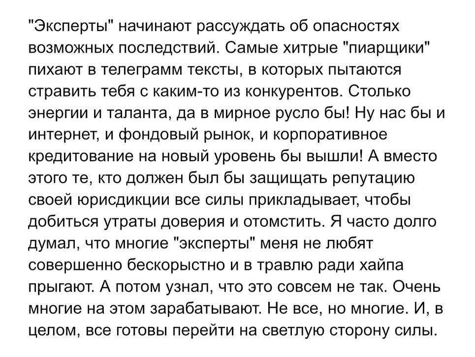 Давайте, раз уже сейчас выходной, я расскажу, что мы узнали про информационные войны? Мы очень мирная группа, но, порой кажется, что мы видели уже почти все и можно писать диссертацию. Откуда берутся эти войны? Как правило - это не столько конкуренты, сколько люди, которые сделали по отношению к тебе или компании какую-то гадость. Пытались смошенничать и им не дали, пытались шантажировать или ещё что-нибудь. Хотели получить много денег и быстро. К сожалению, такие люди не очень глубоки в знаниях, но, как правило, всегда пытаются в своих неудачах обвинить кого-то другого и строят для себя очень стройную теорию о том, почему тот, кого ты пытался кинуть, на самом деле - жулик, в отличие от доблестного тебя. Решают объявить войну, пишет Турлов в Instagram.