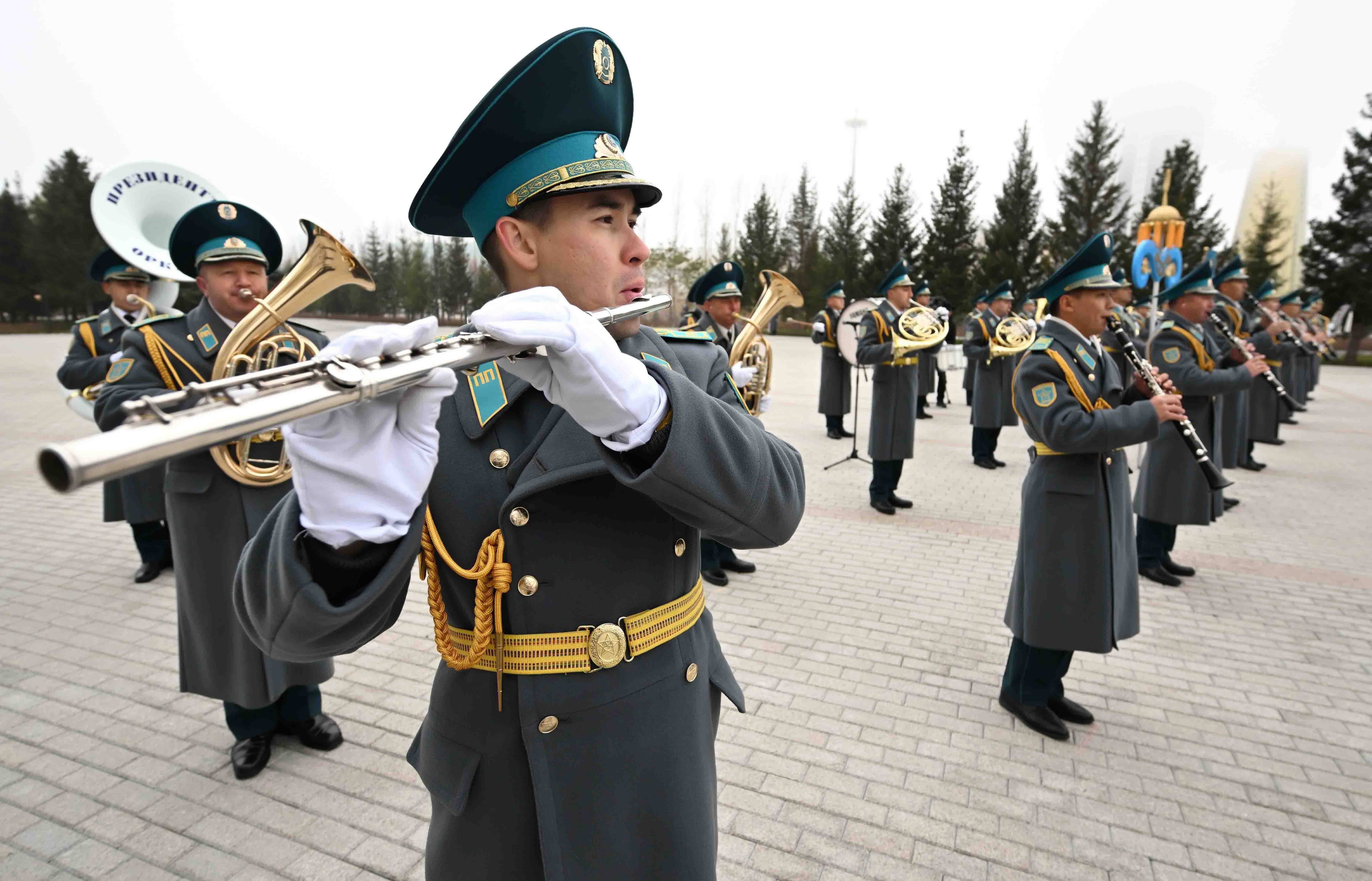 Командир роты Почётного караула передал президенту рапорт, после чего флаг подняли под звучание Государственного гимна.