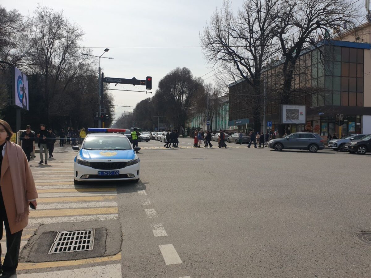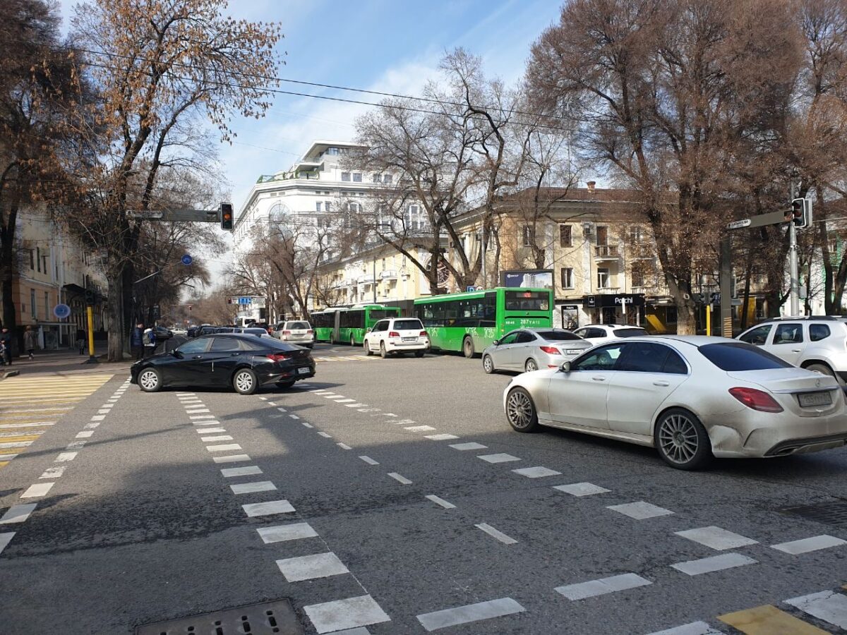 Перед площадью Астана образовалась пробка. Дело в том, что по проспекту Абылай хана от перекрёстка с проспектом Абая отключили светофоры. Сотрудники полиции пропускали транспорт для объезда площади.
