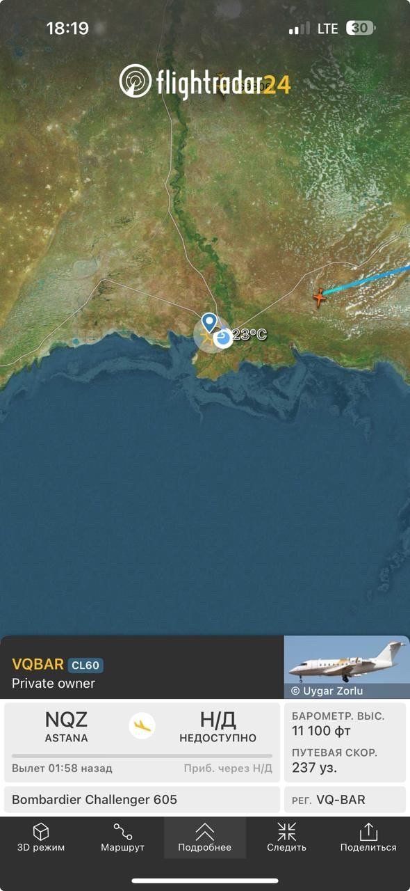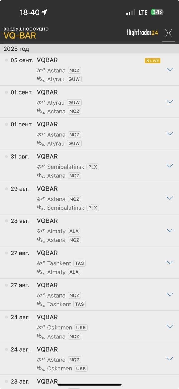 Но вернёмся к перелётам — они осуществляются преимущественно внутри Казахстана. По нашим данным, в период с 24 августа по 5 сентября их было восемь. Пункты взлёта и посадки — Астана, Алматы, Атырау, Семей, Усть-Каменогорск. Есть два международных рейса: Астана — Ташкент и Ташкент — Алматы.