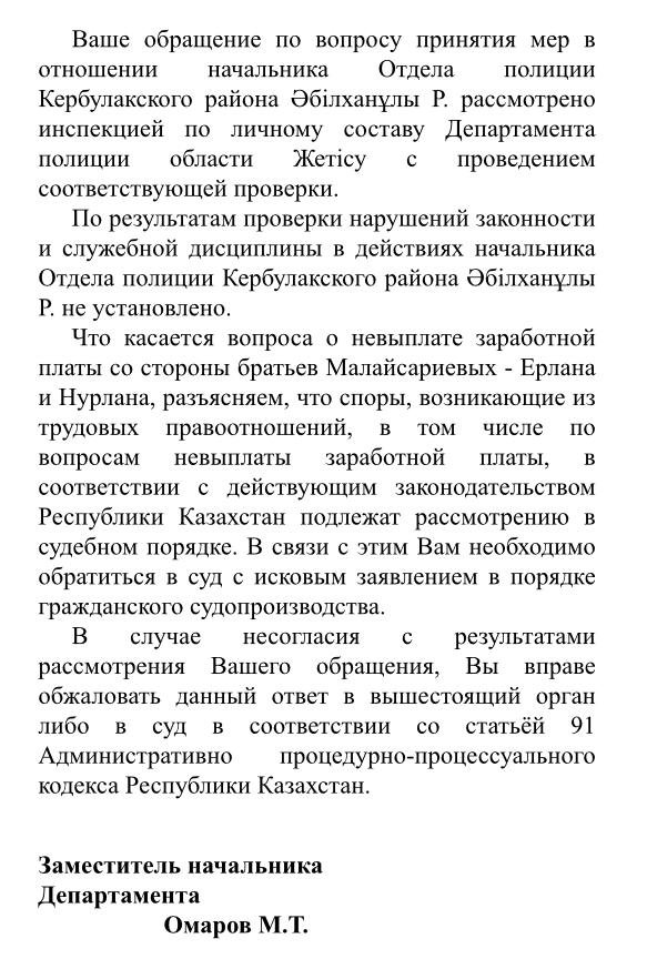 Адвокат показал нам ответ за подписью заместителя начальника ДП области Жетысу полковника полиции Мадияра Омарова. В нём говорится, что по результатам проверки нарушений законности и служебной деятельности в действиях Абылханулы не установлено. Рыбалко советуют обращаться в суд с исковым заявлением о взыскании невыплаченной зарплаты со стороны братьев Малайсариевых.