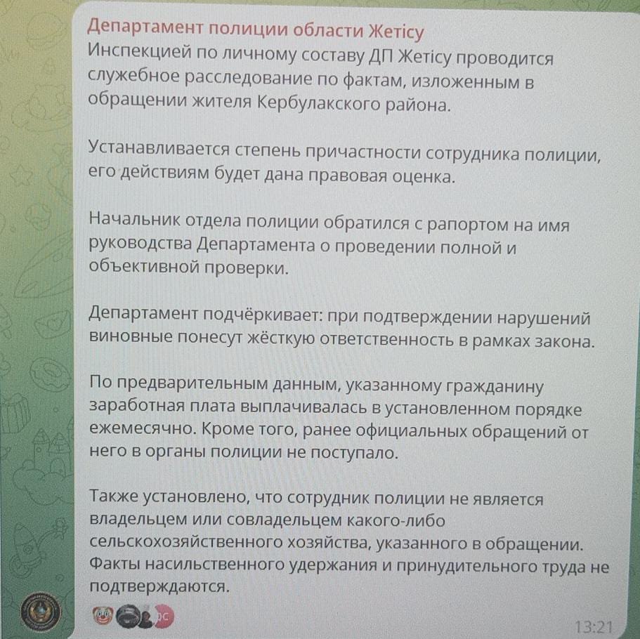 Мы писали про историю сельчанина Олега Рыбалко, который пять лет проработал в крестьянском хозяйстве, но так и не получил зарплату. По словам мужчины, ферма принадлежит начальнику отдела полиции Кербулакского района Рустему Абылханулы и его братьям Ерлану и Нурлану Малайсариевым. Трудятся там сейчас трое работников. Сам он до недавнего времени тоже работал на ферме трактористом, но потом сбежал. Рыбалко записал видеообращение на имя министра внутренних дел и начальника ДП области Жетысу, в которой жаловался на трудовую эксплуатацию и угрозы со стороны бывших работодателей. Он просит генералов оградить его от угроз и преследования братьев-фермеров и помочь получить 15 миллионов тенге. Именно такую сумму, по словам Рыбалко, ему задолжали за пять лет работы в частном крестьянском хозяйстве.