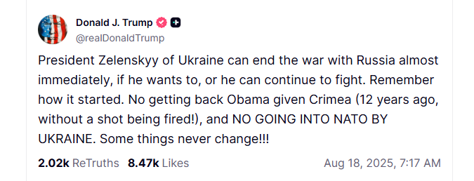 «Зеленский может завершить войну с Россией почти сразу, если захочет, или может продолжать воевать. Вспомните, как все началось. Никакого возвращения отданного Обамой Крыма (12 лет назад, без единого выстрела!) и никакого вступления Украины в НАТО. Некоторые вещи никогда не меняются».