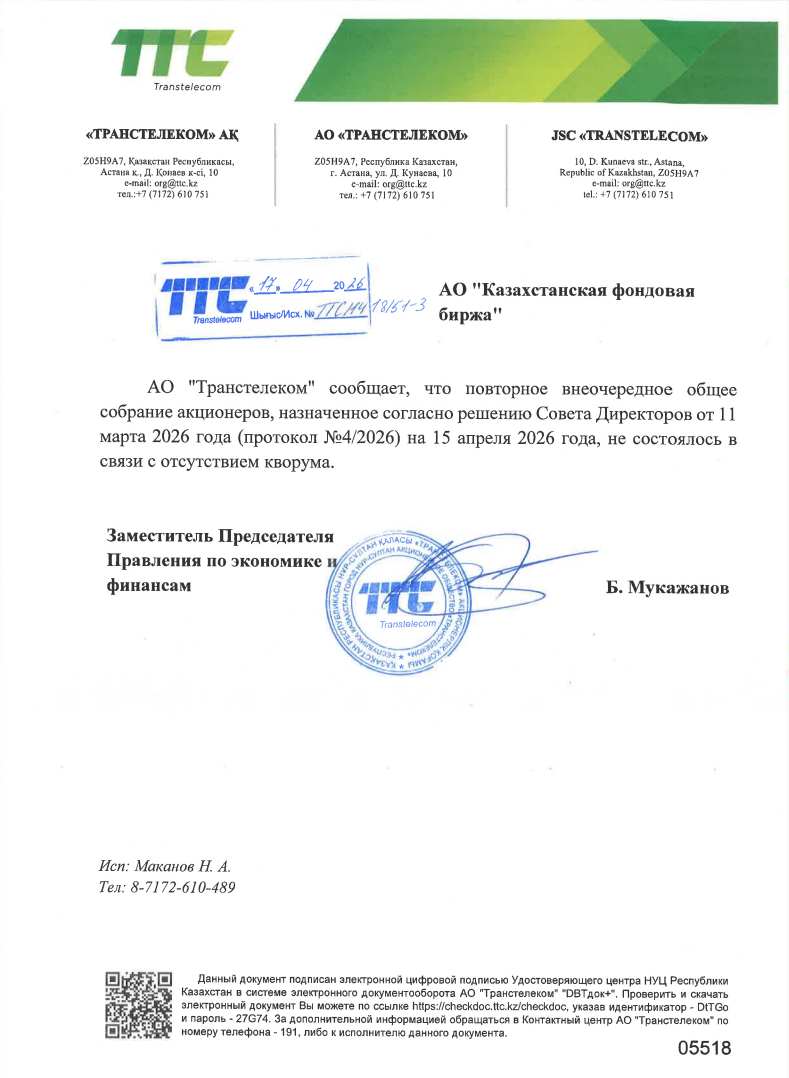 Акционеры АО «Транстелеком» уже третий раз подряд не обеспечивают кворум для проведения общего собрания. Компания вновь опубликовала уведомление на Казахстанской фондовой бирже, сообщает Orda.kz.