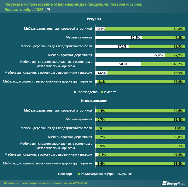 Хуже всего по итогам 11 месяцев 2022 года были позиции казахстанских производителей по таким категориям, как деревянная мебель для столовых и гостиных (здесь импорт перекрыл 89,3% спроса), а также прочая разнообразная мебель для сидения, не включённая в другие группы (импорт — 97,9%).