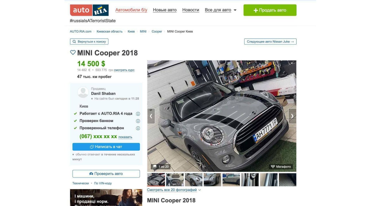 Серый Mini Cooper 2018 года выпуска, уже с украинскими номерами, продавали за 14,5 тысячи долларов (около 7 млн тенге). На данный момент объявления на сайте нет.