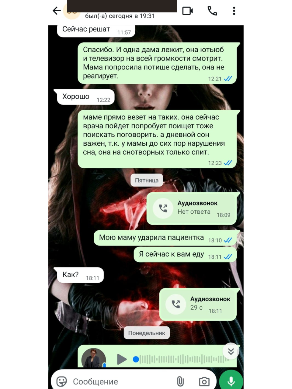«И под конец они привели в палату эту женщину. И у мамы просто припадок начался. Эта женщина очень громкая, несмотря на то, что мы все только что, включая и советника врача, заведующую отделением, нас было шесть или семь человек, посмотрели камеры, эта женщина приходит и говорит: „Когда я тебе что-то говорила? Когда я тебя била?“».