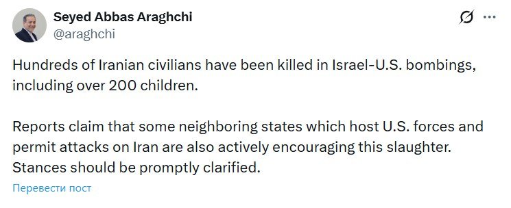 «Сообщается, что некоторые соседние государства, которые размещают у себя американские силы и позволяют наносить удары по Ирану, также активно поощряют эту бойню. Их позиции должны быть незамедлительно прояснены», написал Аракчи в X.