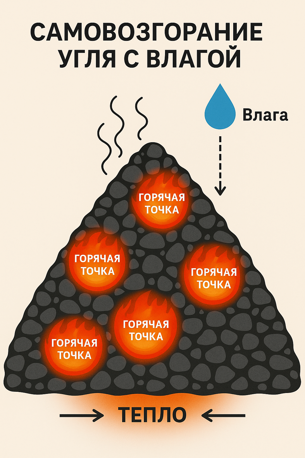 Это звучит парадоксально, но вода и правда может спровоцировать самовозгорание угля. Уголь окисляется на воздухе, пусть и медленно. При этом выделяется тепло. В маленьких количествах это не страшно, но если уголь насыпан кучей, тепло не успевает рассеиваться. Температура внутри постепенно растёт. А если есть ещё и вода, она проникает в поры угля. Пока вода испаряется, она отнимает тепло, но потом конденсируется в более глубоких слоях, создавая зоны повышенной влажности, где кислород легче проникает и окисление активизируется.