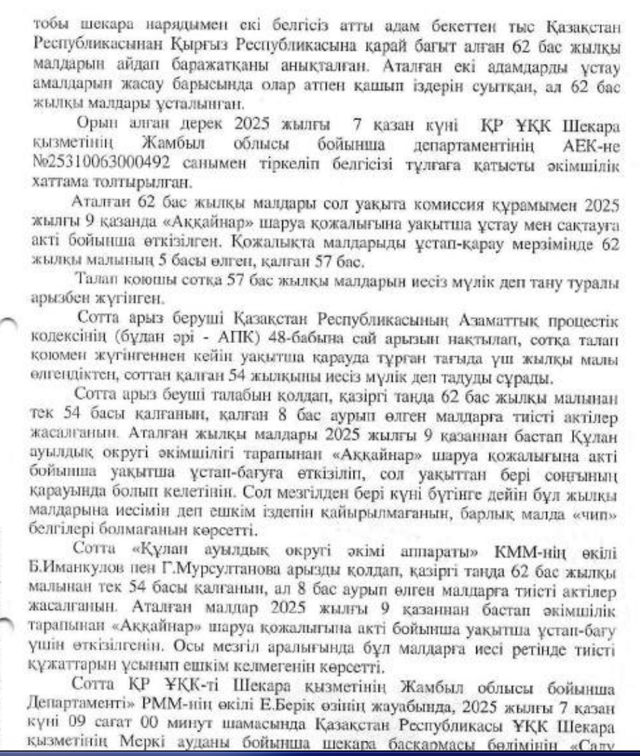В постановлении суда говорится, что 7 октября 2025 года пограничники обнаружили 62 лошади, которых двое неизвестных перегоняли из Казахстана в сторону Кыргызстана вне пункта пропуска. При попытке задержания оба сбежали. Лошадей забрали пограничники.
